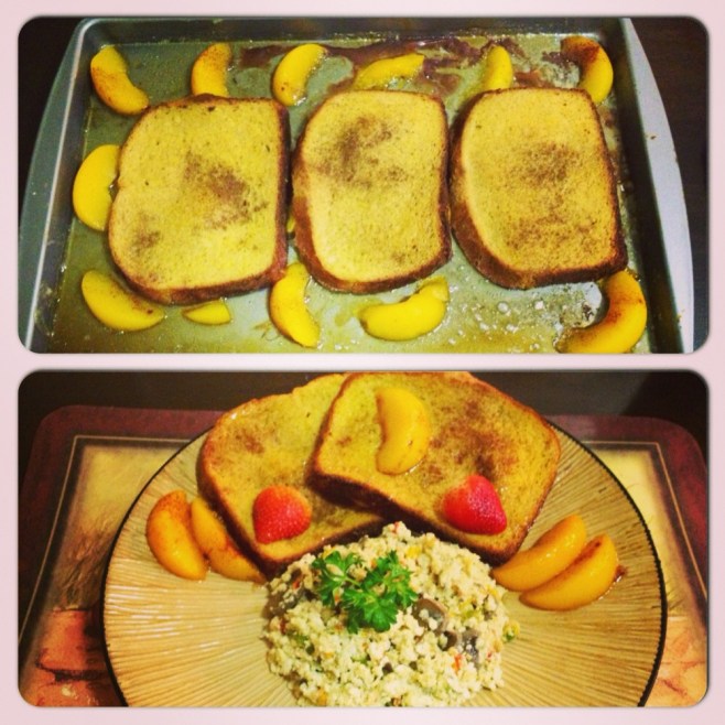 My homemade birthday breakfast of baked French Toast & Peaches with Scrambled eggs whites and veggies (mushroom, peppers, onion).