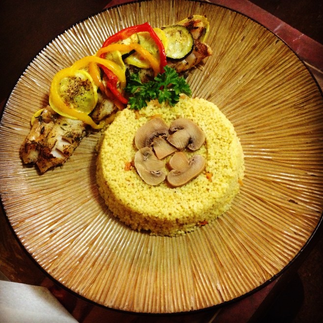 My home-cooked couscous with baked red snapper, with zucchini and squash.