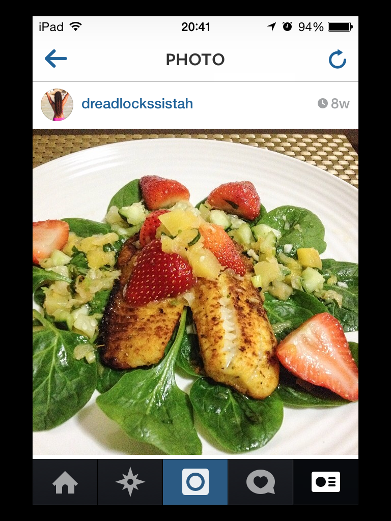 Homemade broiled tilapia salad in salsa sauce with pinapple and strawberries.