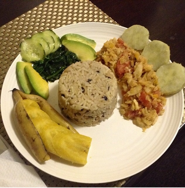 My home-cooked salt fish/cod fish cook up with brown rice & black eye peas, steamed sweet plantain, steamed sweet potato, spinach, avocado, cucumber.