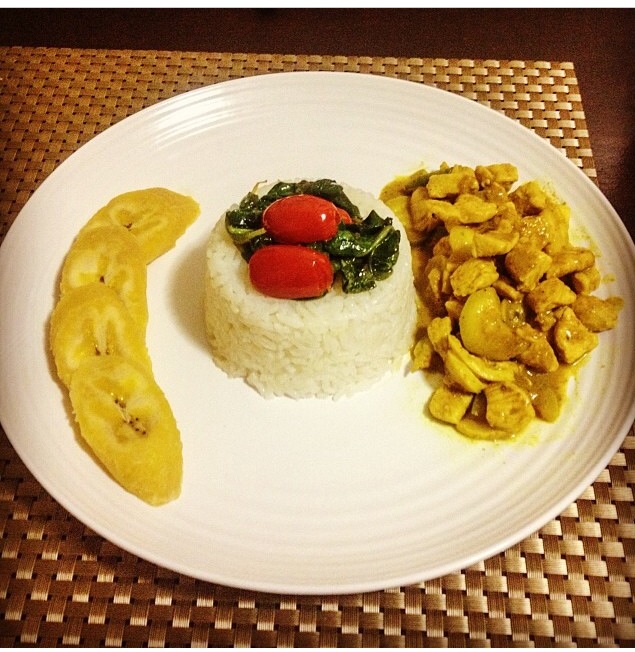 My home-cooked curry chicked with Jasmine rice and sweet steamed plantains.