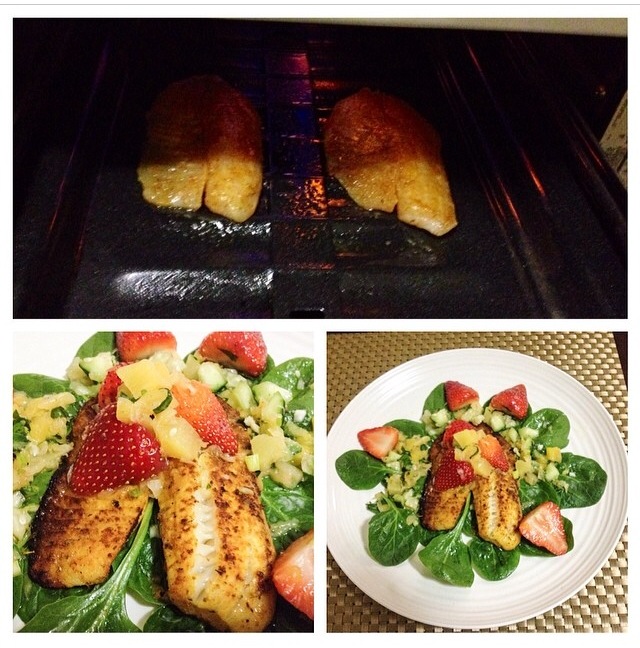 My homemade broiled tilapia salad in salsa sauce with pinapple and strawberries.