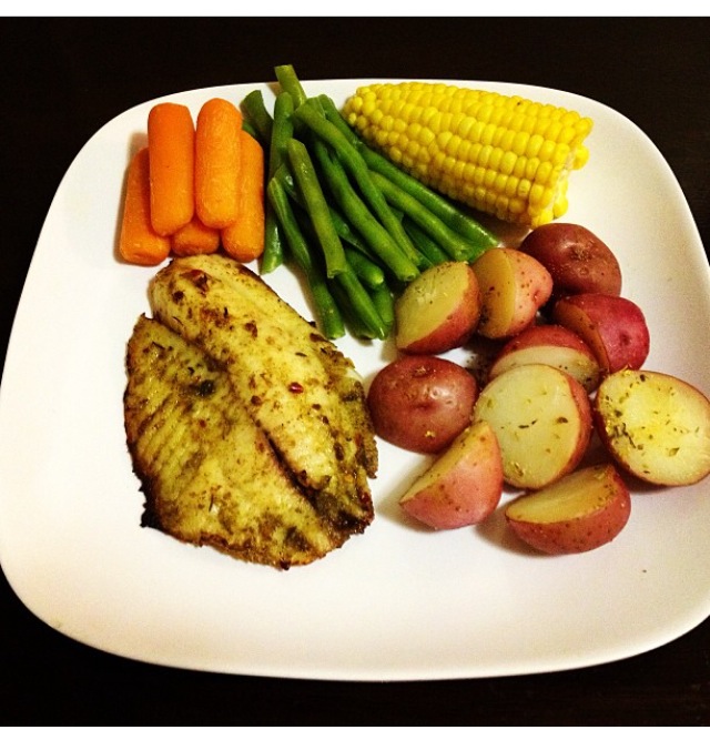 My homemade baked tilapia with baked garlic & herb new red potatoes and veggies.